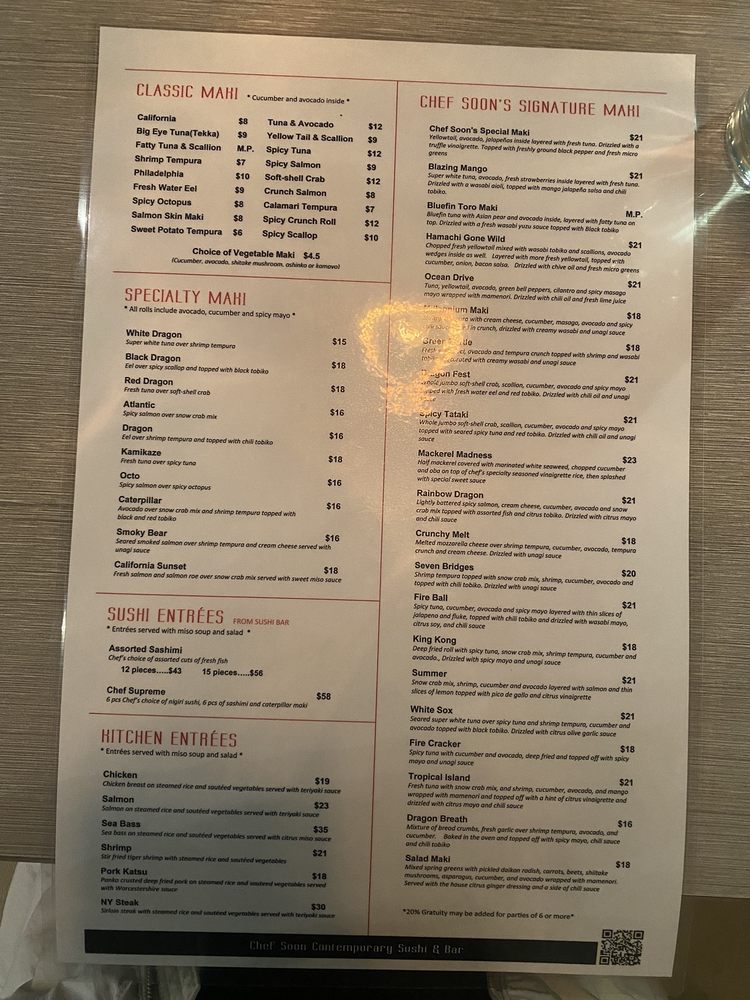 Welcome to Chef Soon Contemporary Sushi, a sushi bar in Woodridge, IL that offers an array of delicious dishes and a variety of amenities. From the 7 Spiced Ahi appetizer to the Edamame and Gyoza, Chef Soon Contemporary Sushi presents a fusion of traditional and modern flavors. The House Salad and Citrus Tuna and Avocado Salad provide refreshing options for those seeking lighter fare. With amenities like outdoor seating, free Wi-Fi, and Happy Hour specials, this restaurant caters to a diverse range of diners. Chef Soon Contemporary Sushi is not just a place to eat; it's an experience for the senses, where every bite tells a story of culinary creativity and passion. Dine here for an unforgettable sushi adventure that will leave you coming back for more.