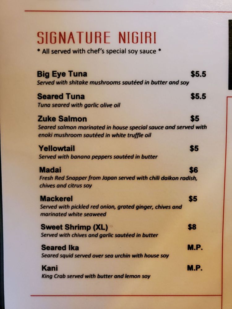 Spicy tuna, cucumber, avocado and spicy mayo layered with thin slices of jalapeno and fluke, topped with chili tobiko and drizzled with wasabi mayo, citrus soy, and chili sauce.