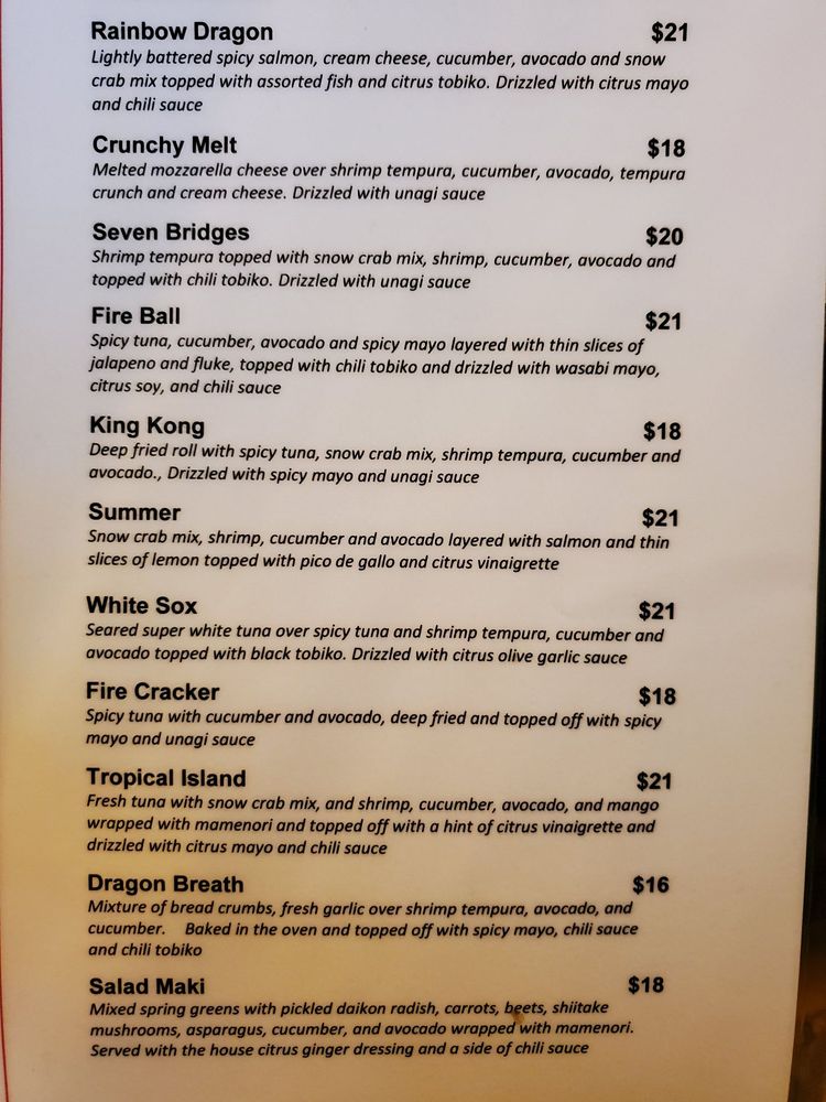Fresh tuna with mixture of scallop, crab meat, and shrimp, and mango wrapped with mamenori and topped off with a hint of citrus vinaigrette and drizzled with citrus mayo and chili sauce.